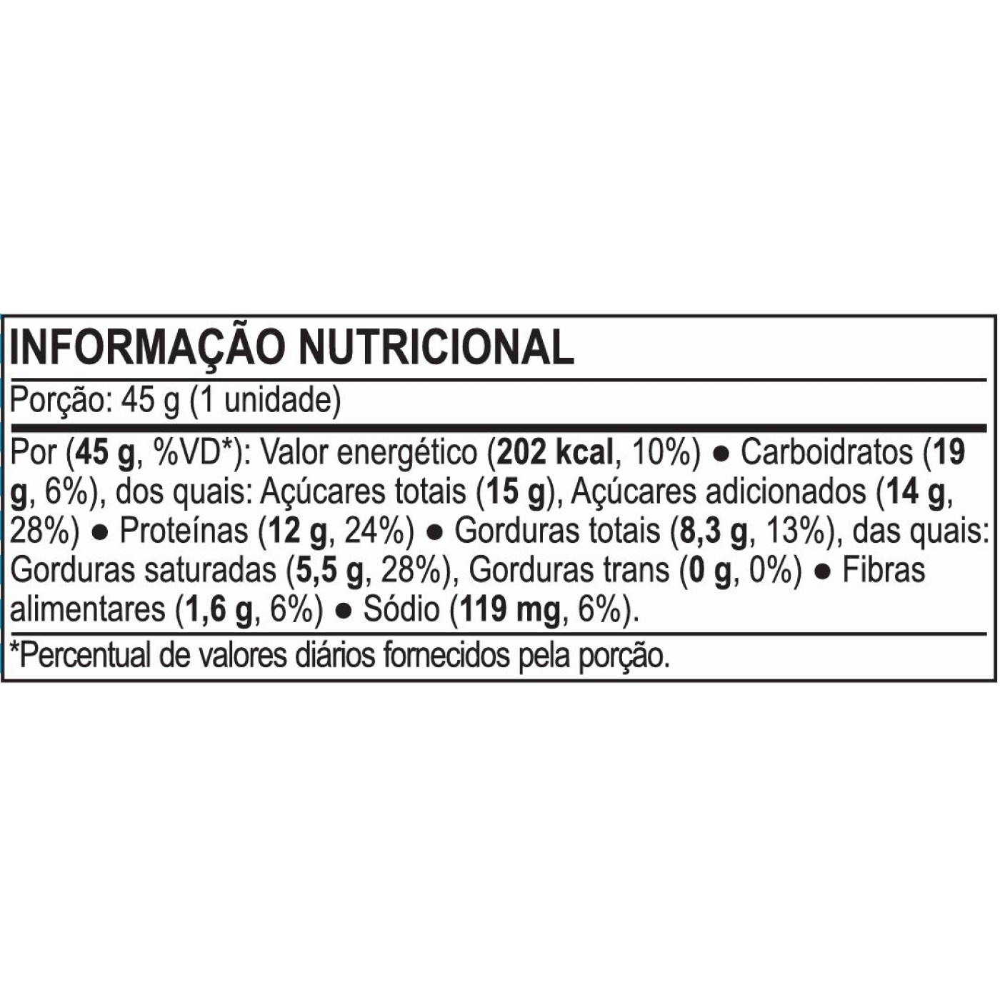 - Display com 12 unidades de barra proteica (45 g cada), formulada para complementar a ingestão de proteínas no dia a dia — do lanche rápido ao pré/pós-treino.