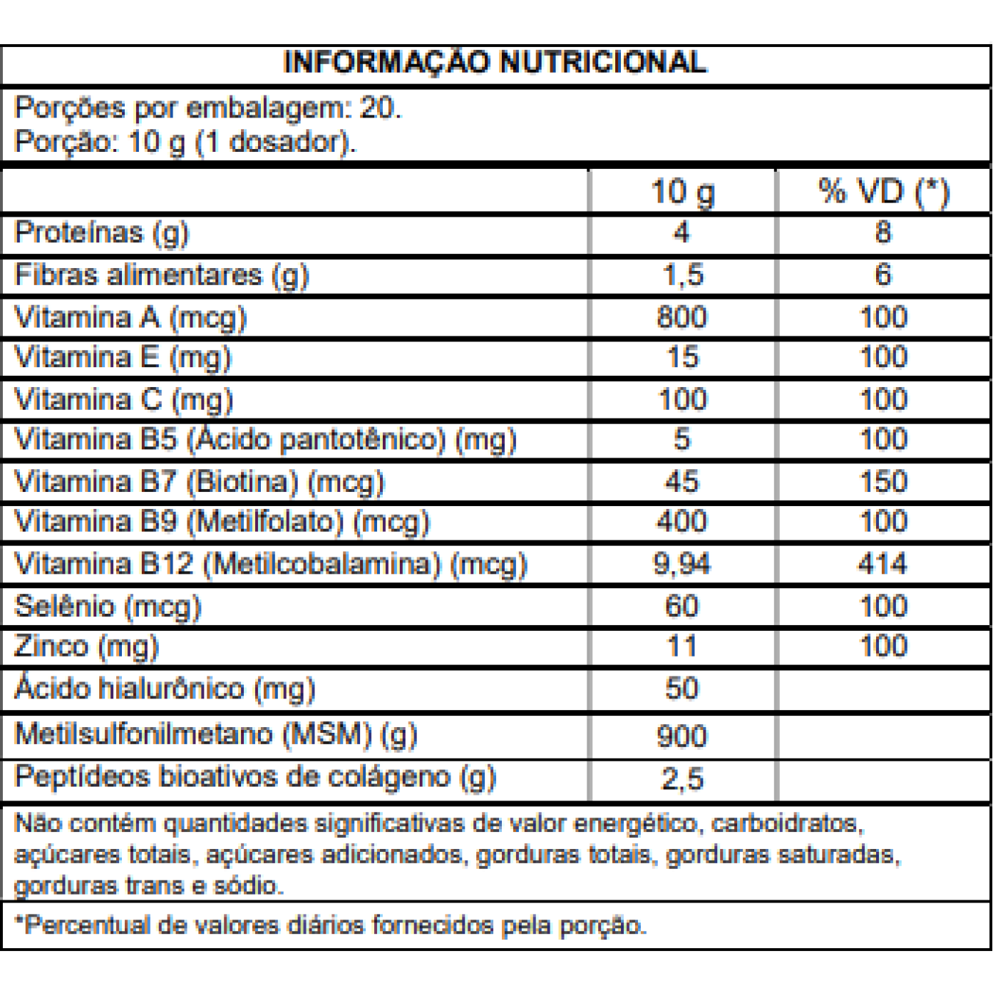 - Ingredientes: colágeno hidrolisado; peptídeos bioativos de colágeno (~2 kDa); polidextrose; MSM; vitamina C; hialuronato de sódio; concentrado de beterraba e cenoura; bisglicinato de zinco; vitamina E; vitamina B5; vitamina A; selenometionina; L-metilfolato de cálcio (B9); biotina (B7); metilcobalamina (B12); dióxido de silício (antiumectante); aroma idêntico ao natural; ácido cítrico (acidulante); sucralose (edulcorante).