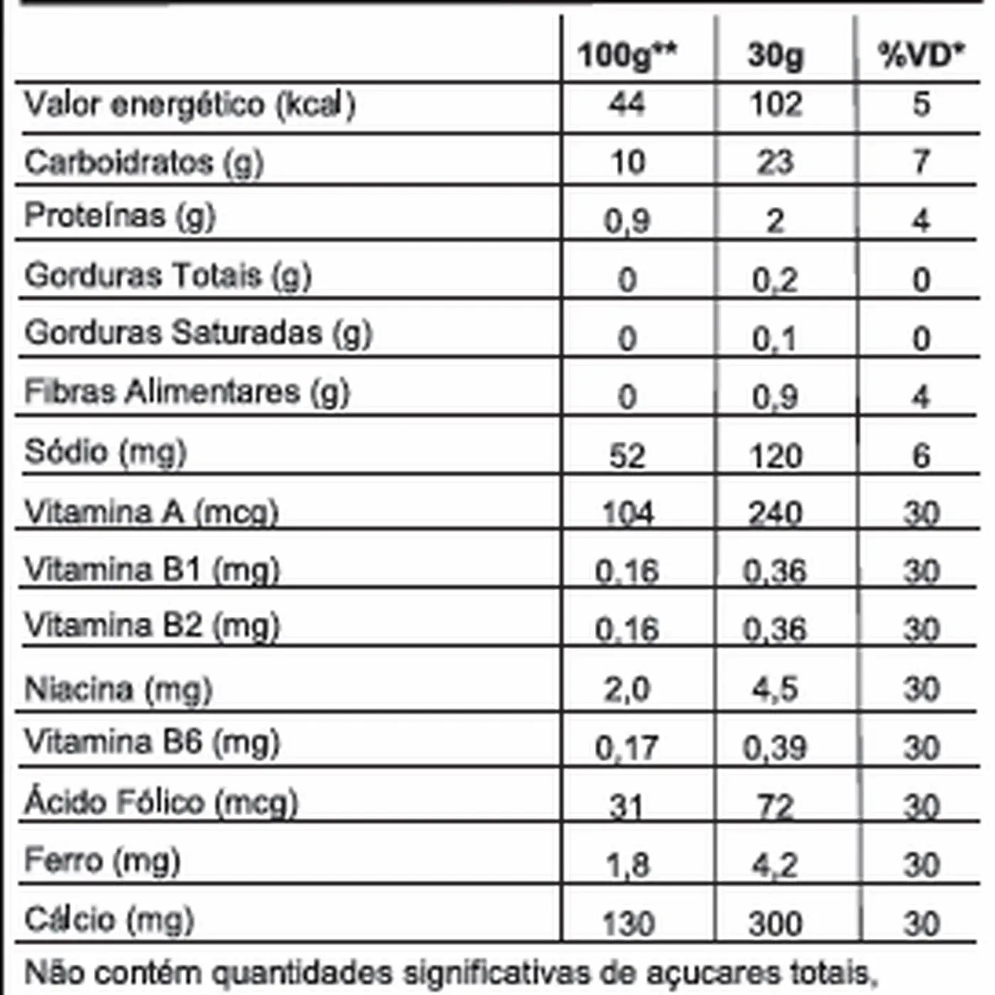 - Vitaminas e minerais: enriquecido com vitaminas A, B1, B2, B6, niacina, ácido fólico e ferro.